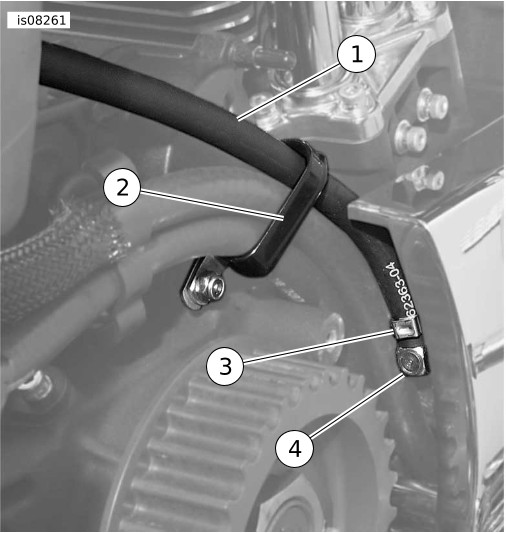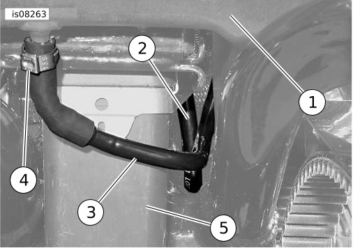 | 2. | Push vent hose down on oil vent hose fitting (4) and secure with clamp. |