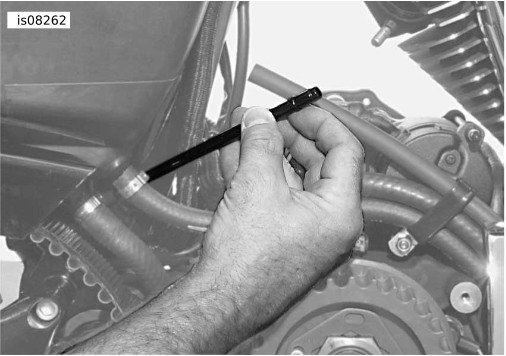 | 7. | See the Service Manual. Install the following items: a. sprocket cover b. rear exhaust pipe assembly c. rear muffler d. right side cover e. rear wheel NOTE If rear brake caliper was disassembled or removed, see Chapter 2 of the Sportster Models Service Manual for the proper assembly and installation procedure. |