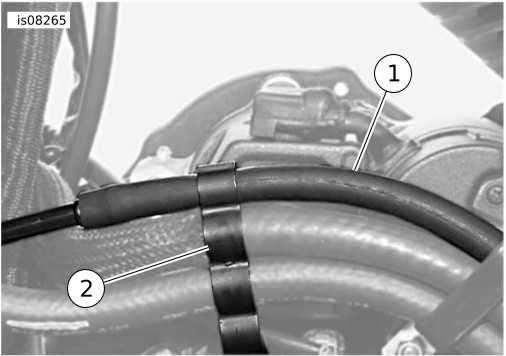 | 6. | See Figure 5. Press vent hose (1) into top slot of hose clip (2). | Figure 2. Routing Vent Tube Assembly