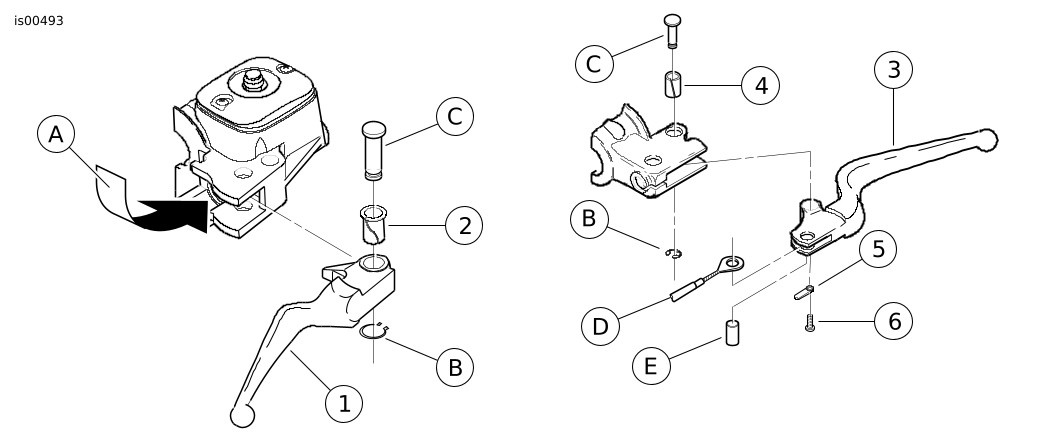 | 2. | See the Figure 2 and the FRONT BRAKE MASTER CYLINDER section of the Service Manual. Remove the retaining ring (B) from the groove in the pivot pin (C). Save the retaining ring for re-use. | |