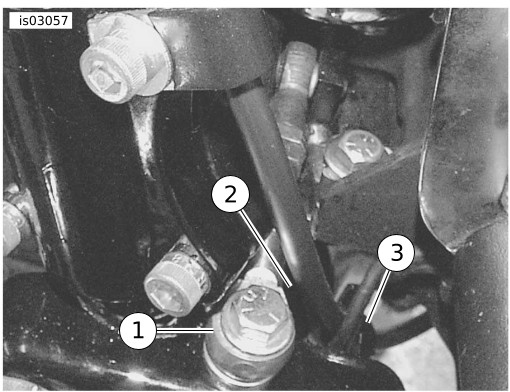 | 4. | See Figures 2 and 3. Continue to route cable down behind regulator, over engine stabilizer link and diagonally under crankcase to clutch release cover on right side of transmission. |