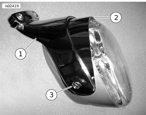 | 3. | VRSCA modellerinde ön far siperini ve ampulleri aşağıdaki şekilde takın: a. Bkz. Şekil 4 . Kitte yer alan Ön Far Siperini (16) alın. Bkz. Şekil 1 . Ön farı (1) ön far montaj braketine sabitleyen iki adet vidayı (3) sökün. Ön far siperini ( Şekil 4 içerisinde gösterilen yönde) ön farın üzerine takın ve iki adet vida kullanarak ön farı siperle birlikte ön far braketine sabitleyin. b. Ön far braketini hizalayın ve iki adet montaj vidası kullanarak üst üçlü kelepçeye takın. Vidaları şu değerlerde sıkın: 11–18 N·m (8–13 ft-lbs) c. Ön far ampullerinin her birini dikkatli bir şekilde ön farın arkasına takın ve sabitlemek için saat yönünde yaklaşık 45 derece çevirin. d. Servis El Kitabı’ndaki talimatlara bakarak ön farı doğru görüş sağlayacak şekilde ayarlayın. | |||||||
