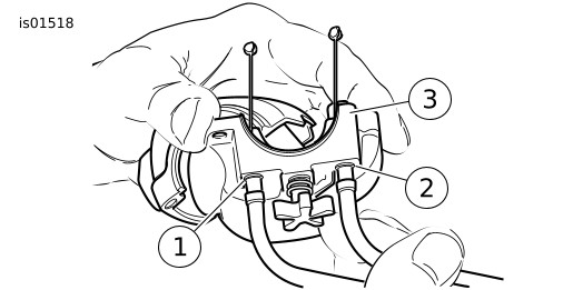 | 5. | Voir Figure 3. Retirer les viroles en laiton des encoches du côté intérieur de la poignée de commande des gaz. Retirer les viroles des raccords d’extrémité de câble. | |||||||||||