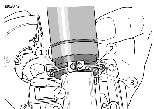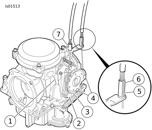 | 2. | Ajuste los cables según sea necesario para que no se desalojen del extremo del cilindro. Compruebe que los cables estén bien asentados en el canal de la rueda del acelerador. Compruebe el funcionamiento haciendo girar la empuñadura del acelerador y observando el comportamiento del cable. | |