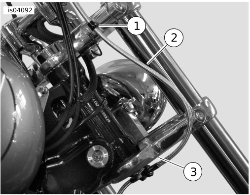 | 1. | Using a motorcycle lift, raise the vehicle frame so that the front forks reach maximum extension. Verify that the lower brake line is not pulled tight when the forks are fully extended. | |