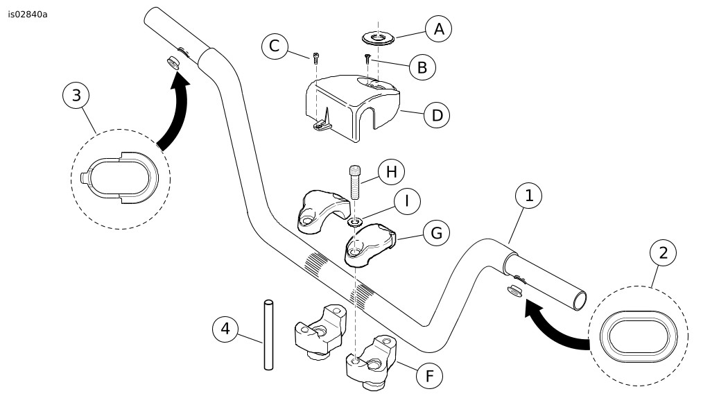 | 13. | Siehe Abbildung 6. Die Schalterkabeltüllen (2 und 3) in die Schalterkabelöffnungen im Lenker einsetzen. | |||||||