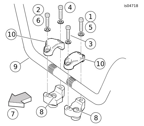 | 3. | Die neuen oberen Lenkerschellen (im Lenker-Riser-Satz enthalten) mit den gerundeten „Nocken” (10) nach außen weisend wie dargestellt positionieren, und lose mit den neuen Schellenschrauben und flachen Unterlegscheiben vom Satz befestigen. HINWEIS Die oberen Lenkerschellen sind so gefräst, dass nach Einbau auf einer Seite des Lenkers ein Spalt zwischen Schelle und Riser verbleibt. Wenn die Nocken nach außen zeigen, ist für die linke Schelle die Seite ohne Spalt auf der Rückseite des Lenkers und auf der Vorderseite an der rechten Schelle. | |||||||||||||||||||||