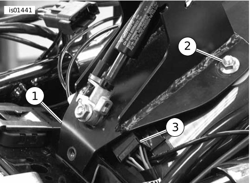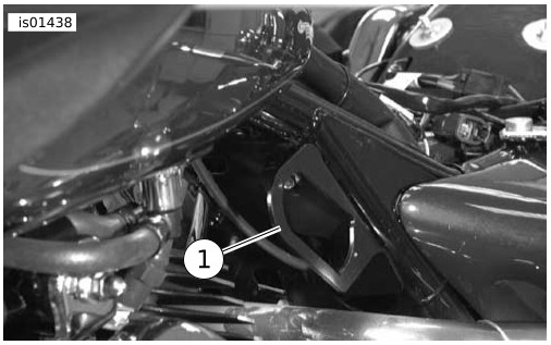 15. | ראה איור 10. העבר את הכבל (1) בין תא המצבר לבין תיבת הנתיכים/החשמל. ייתכן שיהיה צורך לשחרר את תיבת החשמל כדי שיהיה מקום לכבל בין המסגרת לבין תיבת החשמל. המשך לנתב את הכבל (1) למעלה מהחלק האחורי של תיבת החשמל אל בין המסגרת והפגוש האחורי, ולבסוף עד לצד העליון של הפגוש האחורי ולתושבת של משענת הגב. |