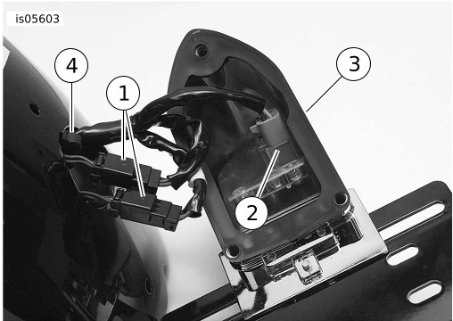 Fjern tre skruer og base til baglygte. Frakobl baglygte stikket (2) og sæt baglygten og pakningen til side. BEMÆRK Før du afbryder blinklysene, skal du markere stikkene for at identificere ledningsnettets højre og venstre forbindelse. |