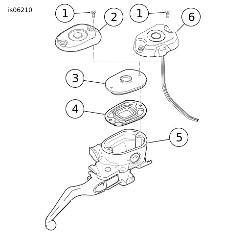 | 4. | Pasang indikator bahan bakar (6), pelat diafragma dan diafragma bawaan (3 dan 4) dan dua sekrup (1) ke silinder master depan (5). Kencangkan sekrup. Torque: 1–1,9 N·m (9–17 in-lbs) Sekrup penutup silinder master | |