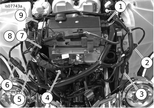 8. | Lihat Gambar 9 . Pasang penutup kotak kabel. Tutup semua konektor sisi pin yang tidak digunakan dengan 72632-10, yang disertakan dengan 692000478 [313] atau dari konektor harnes fairing stok [162] pada model FLHX. |