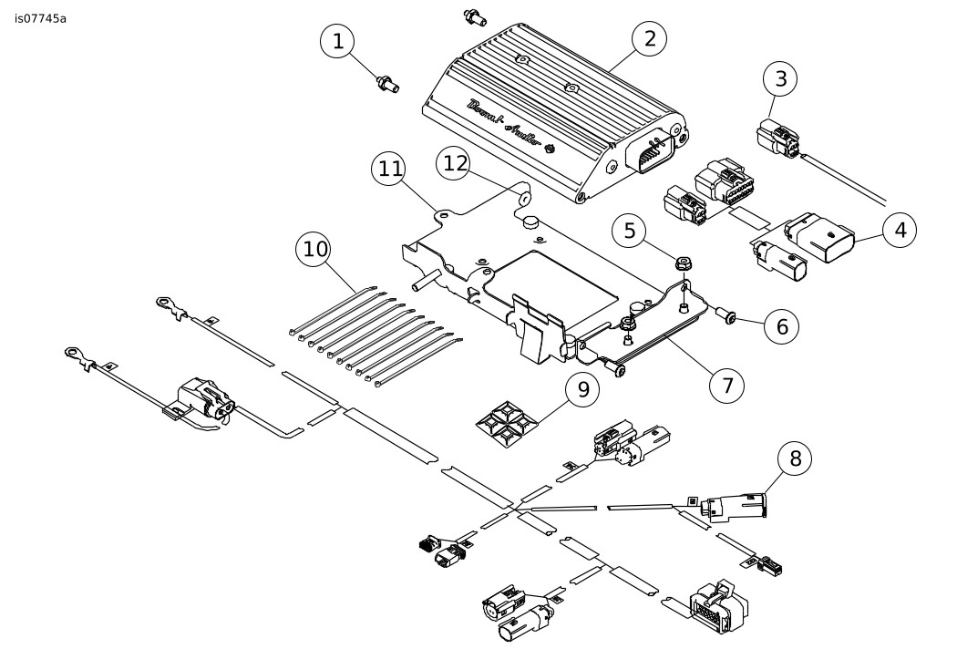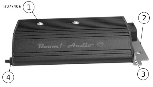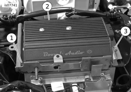 3. | Lihat Gambar 7 . Masukkan konektor [184] dan [280] konektor jangkar ke dalam braket amplifier dan jika ada, posisikan antena SiriusXM & NAV. CATATAN Braket amplifier memiliki klip untuk pemancar pembuka pintu garasi. Jika sepeda motor memilikinya, pindahkan ke lokasi ini. Baut tanam di depan braket hanya untuk penggunaan CVO. |