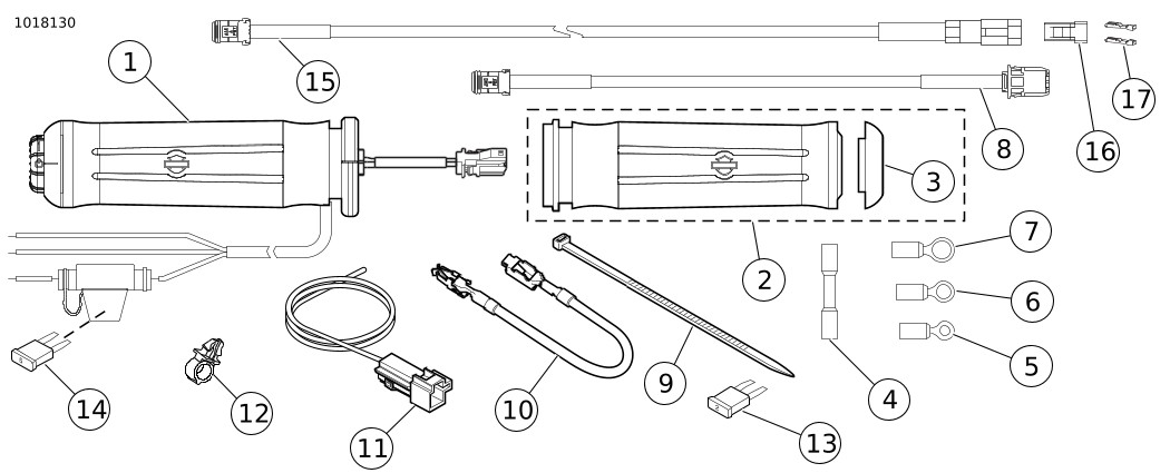 2. | ראה איור 8 . קח את הידית המחוממת של צד שמאל (1), רתמת חוט ארוך (15) ורתמת מאריך החוט הקצר (8) מהערכה. קבע אם נדרשת הארכה עבור התקנה זו: האם תושבת הפין השחור נמשכת אל מעבר לקצה הנגדי של הכידון? אם כן: ההארכה אינה דרושה. ניתן להשליך אותה. נתק את רתמת החוט מהידית של צד שמאל. אם לא: נתק את רתמת החוט מהידית של צד שמאל. חבר את בית הפין שבהארכה אל בית שקע ה-JAE ל-2 פינים ברתמת החיווט. שים בצד את הידית השמאלית, את רתמת החוט או מכלול הרתמה. a. חבר זמנית את בית השקע ברתמת החיווט אל בית שקע ה-JAE ל-2 פינים במוליך חיבור ארוך (pigtail) באורך 3 אינץ' שבקצה ידית הכידון המחוממת השמאלית. b. החזק את הידית ואת רתמת החוט המצורפת למקומם לאורך מחוץ לכידון כאילו המכלול הותקן על הכידון. c. תושבת הפין השחור בקצה של רתמת החוט צריכה לעבור מעבר לקצה הימני של הכידון. הערה אל תחתוך חוטים מובילים אל המחבר הירוק שעל חיישן הידית המפותלת. חתוך את השרוול המתכווץ השחור בלבד. | |
