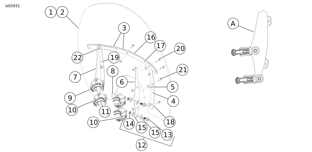 7 | Braket, dudukan kaca depan, kiri Braket, dudukan kaca depan, kiri, hitam | 59844-05 58398-09 | 21 | Sekrup, kepala kancing TORX, pengunci geser, 12-24 x 5/8 inci (7) | 2921A | |