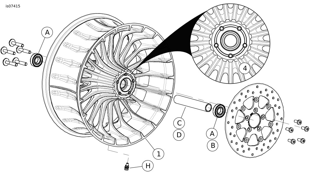 3. | הרכב את רכיבי ערכת הגלגל, דיסק בלם רגיל, וגלגל שרשרת לגלגל והשתמש בטבלת חלקי הטיפול המתאימה. עיין במדריך הטיפולים. הערה התקן תחילה את המיסב הראשי על פי מדריך הטיפול המתאים ומסיר/מתקין מיסב הגלגל. אל תתקין טריז מיסב עם הגלגל הזה. עבור ערכות 40900057, 40900324: החריצים בצד ימין של הגלגל מצביעים על הצד של המיסב הראשי. | |