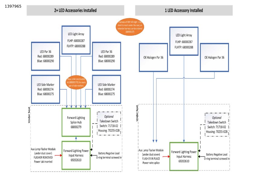 | 1. | Sambungkan harnes daya/input. a. Lepas caddy atas. Lihat manual servis. b. Lepaskan baut terminal baterai negatif (-) . c. Pasang terminal cincin 69202610 ke baut terminal baterai negatif (-). d. Lepaskan baut terminal baterai negatif (-). Kencangkan. Torque: 6,8–7,9 N·m (60–70 in-lbs) e. Lepas penutup samping kiri. Lihat manual servis. f. Arahkan kabel merah dengan terminal pipih di bawah rel rangka kiri. g. Jika memasang 68000289, 68000289A atau 68000290, 68000290A, lepaskan flasher dan pasang terminal pipih ke rongga 86 dari rongga relai pemantauan [69B]. h. Jika tidak memasang 68000289, 68000289A atau 68000290, 68000290A, biarkan flasher di tempatnya dan sambungkan dengan kabel di rongga 86. i. Pasang penutup samping kiri. Lihat manual servis. j. Pasang caddy atas. Lihat manual servis. | |