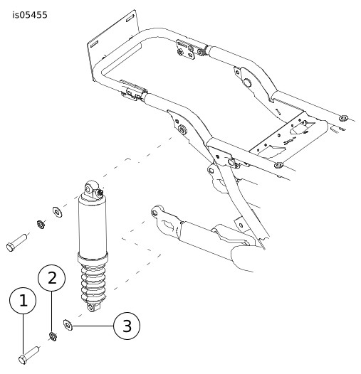 8. | ראה איור 3 . הסר את בורגי ההרכבה התחתונים (1), דסקיות הקפיץ (2) והדסקיות השטוחות (3) מבולמי זעזועים. | |||||||||||||||