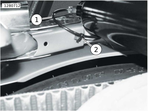 5. | Pasang selang udara dan air fitting jika diperlukan: a. Untuk model 1997-2001: Pasang dua air fitting melalui dua lubang paling bawah (bertanda "F" dan "R") di braket sisi kanan. b. Untuk model 2002: Model ini hanya memiliki satu air fitting yang harus dipasang di lubang bertanda "F" pada braket sisi kanan. c. Untuk model 2003 dan setelahnya: Lihat Gambar 4 . Lepas selang udara peredam kejut sisi kiri (1) dari katup udara, dan salurkan ulang di bawah pemasangan shock bagian atas. Gunakan tali kabel (2) untuk menambatkan selang udara sebagaimana ditunjukkan dan mencegahnya melipat dan terjepit. Pasang lagi selang udara pada katup udara, dan pasang katup udara di lubang bertanda “F” pada braket sisi kiri. |
