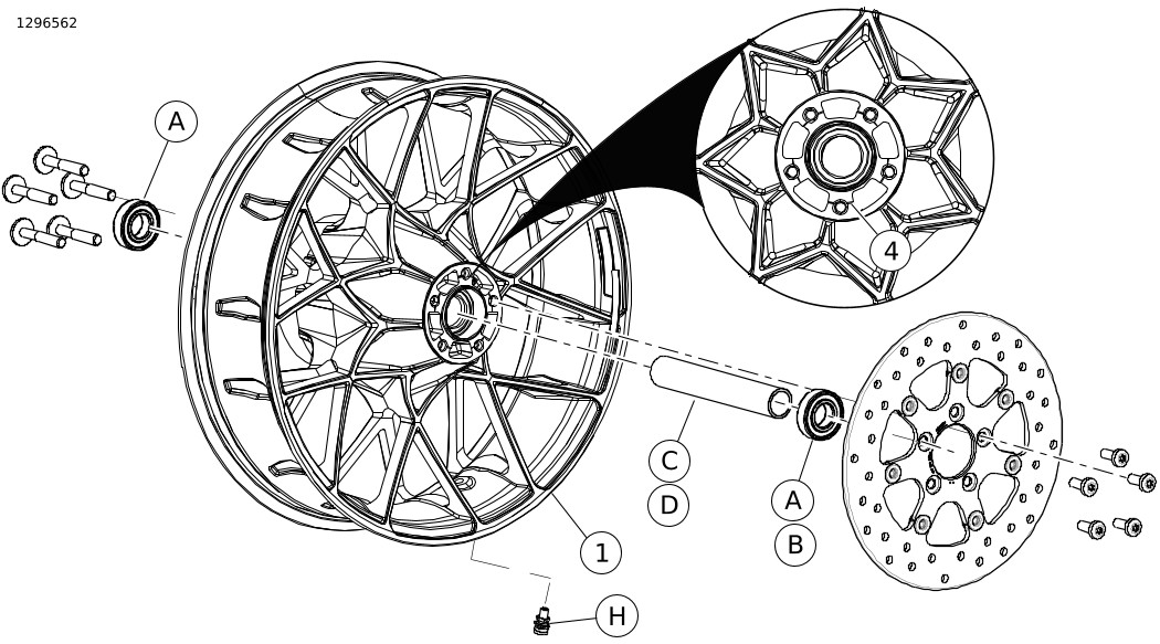 | 3. | Rakit komponen kit pemasangan roda, cakram rem , dan sproket bawaan ke roda, menggunakan tabel komponen servis yang sesuai. Lihat manual servis. CATATAN Pasang bantalan utama terlebih dahulu dengan menggunakan manual servis dan PELEPAS/PEMASANG BANTALAN RODA yang sesuai. Jangan pasang Shim Bearing pada roda ini. Alur yang dibubut pada sisi kanan roda mengindikasikan sisi bantalan utama. | |