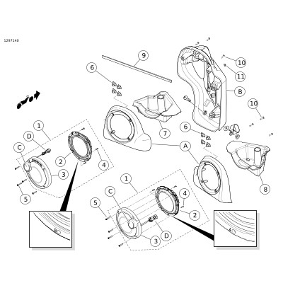 21. | Kencangkan harnes kabel dengan menggunakan tali pengikat kabel. Pastikan kabel tidak mengganggu pergerakan kemudi atau suspensi. CATATAN Speaker bagian bawah fairing telah ditentukan letaknya. Ada tulisan "BOOM! AUDIO STAGE II" di bagian atas cincin trim speaker kiri. Tidak ada tulisan di sisi kanan. | |