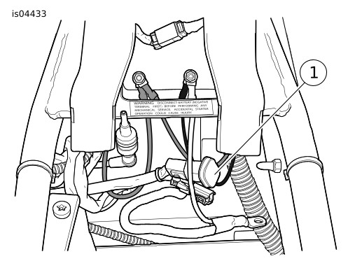 | 4. | Lihat Gambar 4 . Identifikasi dan lepaskan steker dari konektor sirkuit aksesori (1) di depan baterai. |