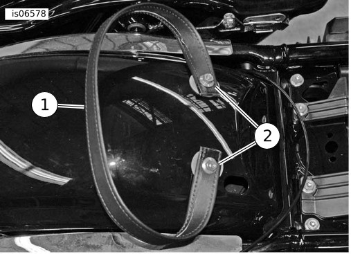 | 9. | Lihat Gambar 5 . Jika telah terpasang, geser bagian belakang sadel melalui tali pegangan, dari depan, hingga slot (2) di depan bawah sadel berada di lidah dudukan sadel (1) pada braket belakang tangki bahan bakar. |