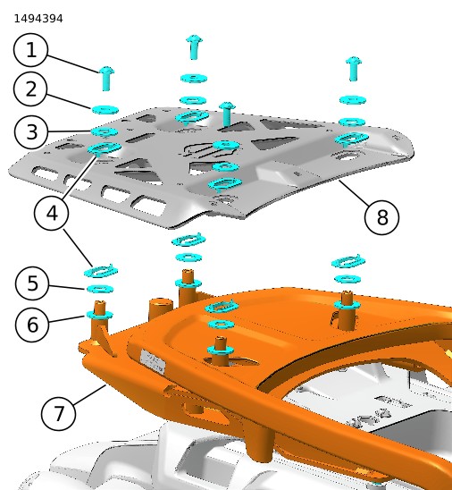 9. | הערה פעל לפי מומנט ההידוק להתקנת הלוח העליון. התכנון של הארגז העילי מאפשר תנועה של הארגז העילי מצד לצד. אם אין פועלים בהתאם להנחיות עלול להיגרם נזק לרכיבים. a. התקן את הדסקיות הייעודיות (6), דסקיות הפלסטיק (5) ומסילות הפלסטיק (4) בתושבת ההתקנה (7). b. התקן את הלוח העליון (8). c. התקן את מסילות הפלסטיק (4), דסקיות הפלסטיק (3), הדסקיות השטוחות (2) והברגים (1). d. הדק את הברגים (1). מומנט סיבוב: 9.5 N·m (7.0 ft-lbs) בורגי הלוח העליון |