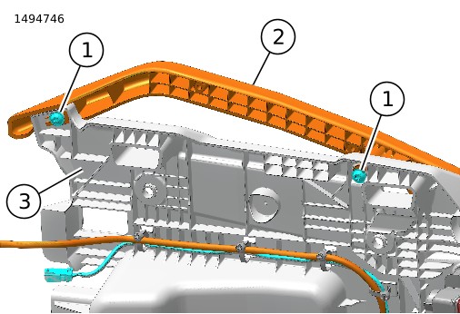 3. | איור 4 נתב את כבל סוגר הנעילה של המושב ואת רתמת החיווט של האור האחורי. אבטח בעזרת אזיקונים חדשים (2). | |