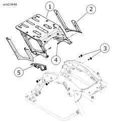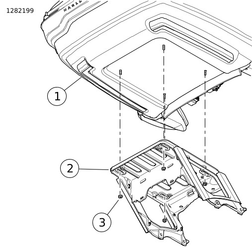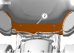 | 6. | הערה בדגמים ללא Tour-Pak יש מרווחים היכן שמרכיבים את תומכות ה-Tour-Pak. מסירים ומתקינים באופן דומה. a. ראה איור 5 . הסר את מחברי הרתמה מהעוגנים שעל התמוכה (1). b. הסר שני ברגים (3) מכל צד. c. הסר את תמוכת ה-TOUR-PAK. |
