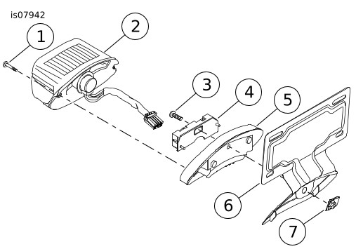 | 3. | Lihat Gambar 7 . Pasang braket pelat nomor. a. Pasang braket pelat nomor (5) pada sepatbor. b. Arahkan semua harnes kabel melalui braket pelat nomor. c. Pasang dasar lampu belakang pada braket pelat nomor. Kencangkan dengan menggunakan sekrup (3). d. Pasang konektor pada dasar lampu belakang. e. Hubungkan lampu belakang dan rakitan lensa pada dasar lampu belakang. Pasang lampu belakang dan rakitan lensa pada dasar lampu belakang dan kencangkan dengan menggunakan sekrup (1). | |