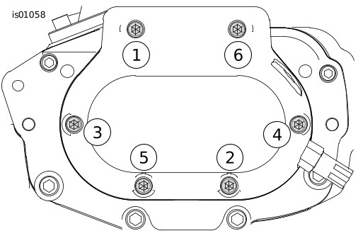 | 4. | See Figure 4. Place the new gasket (purchased separately) on the clutch release cover Install the cover. Tighten the six screws in the order shown to . Torque: 9.5–10.2 N·m (84–108 in-lbs) hex socket screw | |