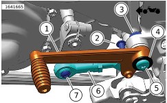 | 4. | איור 2 הסר את רגלית ההילוכים (1) ואת מוט מעביר ההילוכים (6) מהזיז במסגרת. | |