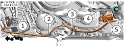 | 7. | כלי רכב ללא רתמה למתג רגלית צד. a. איור 7 חבר את רתמת מעביר ההילוכים המהיר ואת תושבת רגלית הצד בצורה רופפת בעזרת אזיקון (3). b. חבר את רתמת מעביר ההילוכים המהיר ואת תושבת המסגרת של רגלית הצד בצורה רופפת בעזרת אזיקון (2). c. ודא שניתוב רתמת מעביר ההילוכים המהיר אינו בא במגע עם מגן המנוע התחתון, רגלית הצד ומסנן השמן. d. ודא שהעלאות/הורדות ההילוכים מתבצעות בטווח תנועה מלא ואינן מושכות את הרתמה. הערה בדוק אם נוצר מגע בין רגלית ההילוכים לבין הגוף של חיישן מעביר ההילוכים המהיר. e. הדק את שני האזיקונים (2, 3). | |