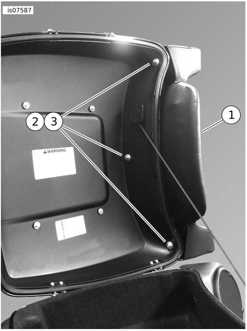 1. | איור 3 הצב את שלושת החפים שבמשענת הגב (1) מול החורים הקדוחים במכסה Tour-Pak. | |