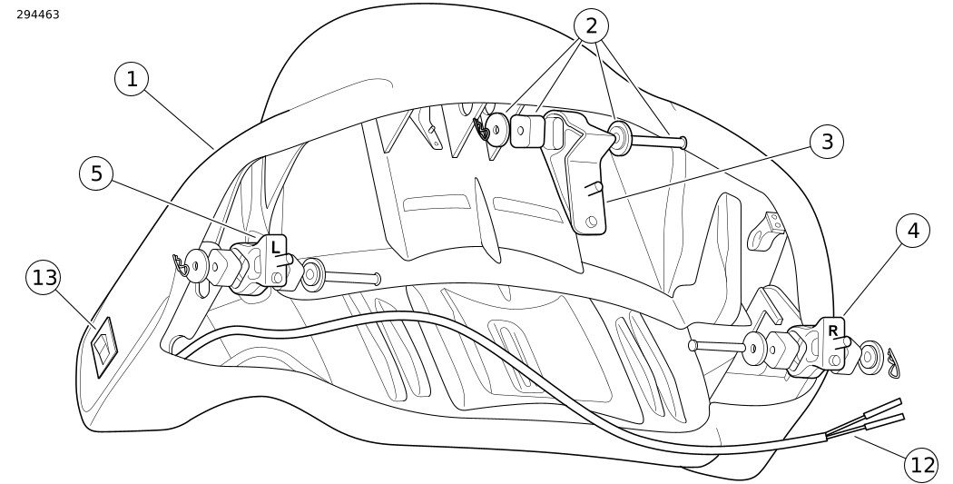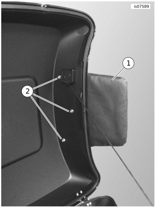 3. | סגור את מכסה ה-Tour-Pak. הערה מומלץ להשתמש במהדק פלסטי עם סרט הדבקה (חלק מס‘ 69200342) ורצועת כבלים (חלק מס 10006) לאבטחת הרתמה. a. ודא כי סגירת המכסה לא צובטת את הרתמה. b. אבטח כנדרש כדי לוודא שתוואי הרתמה אינו מתנגש במכסה. | |