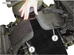 | 6. | איור 9 בדוק את התאמת כתפיות הרתמה בצד שמאל (1) ובצד ימין (2) מעל הכנף האחורית. אל תאבטח את הרצועות בשלב זה. a. אם יש מרווח, התקן את החלק האמצעי של כתפיות הרתמה. b. Velcro הצב את כתפיות הרתמה באמצע. |