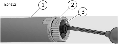1. | הסר את ידיות הכידון. עיין במדריך הטיפולים. הערה לחיישן הידית המסתובבת בצד ימין של הכידון יש כיסוי איטום המגן על האלקטרודות הפנימיות מפני לכלוך ולחות, ומשרתת גם כהתקן נעילה לידית המצערת בכידון. כדי להסיר את ידית הכידון, ייתכן שיהיה צורך במשיכה קלה כדי לשחרר את פיני המיקום בידית מהחלק השקוע בכיסוי האיטום. לאחר הסרת ידית, בדוק את מיקומו של כיסוי האיטום. אם כיסוי האיטום עדיין מהודק אל הפינים בתוך ידית המצערת הישנה, ניתן להשליך אותו יחד עם הידית. אם כיסוי האיטום עדיין מחובר אל קצה חיישן הידית המסתובבת:
