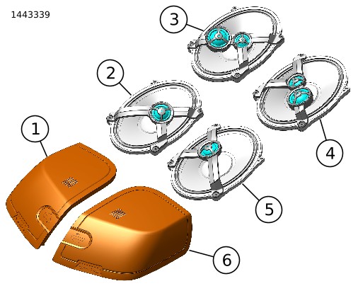 1. | Gambar 5 Pasang speaker (2, 5 atau 3, 4) ke dalam penutup tas sadel. CATATAN Sekrup panjang (3), sekrup pendek (5), penjarak (6), dan harnes disertakan dalam KIT PEMASANGAN HARNES SPEAKER TAS SADEL (PN 76000979). Lihat Persyaratan Pemasangan. a. Gambar 4 Arahkan speaker ke penutup tas sadel. | |