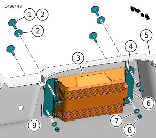 3. | הערה ודא שמחבר המגבר מותקן כשהוא פונה לעבר צד שמאל של הרכב. a. הנח את המגבר (3) עם התושבות (6, 9) על ארבע הרפידות המוגבהות. b. הרכב שתי דסקיות גדולות (2) על הברגים העליונים (1). c. הרכב דסקית גדולה אחת (2) על הברגים התחתונים (1). d. התקן ברגים מהצד הפנימי של ארגז המטען. e. הרכב דסקיות קטנות (7) ואומים (8) מהצד החיצוני של ארגז המטען. הדק. מומנט סיבוב: 11–12 N·m (97–106 in-lbs) אומי תושבת ההתקנה של המגבר |