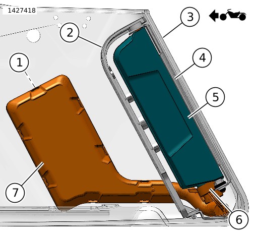 5. | CATATAN Penyandingan kendaraan ke komponen Bluetooth hanya bisa dilakukan sekali saja kecuali perangkat Bluetooth baru sedang ditambahkan atau karena kegagalan komponen sistem. Dongle Bluetooth (1) hanya dapat disandingkan ke satu perangkat seluler dalam satu waktu. Penyandingan dongle dapat dihentikan melalui aplikasi audio atau menekan sakelar penyandingan (7) yang terletak di harnes. Pasang sakelar penyandingan (7) di tempat yang tidak dapat teraktifkan secara tidak sengaja selama pengoperasian kendaraan. a. Di dalam fairing dekat kepala kemudi. |