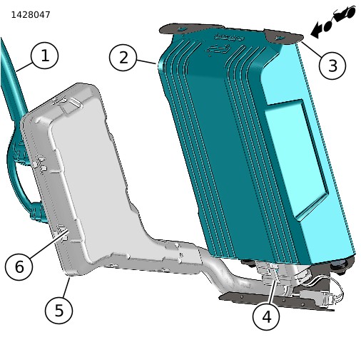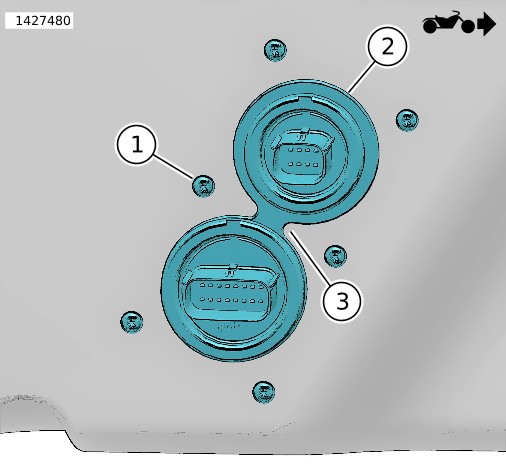 7. | CATATAN Penyandingan kendaraan ke komponen bluetooth hanya bisa dilakukan sekali saja kecuali perangkat bluetooth baru sedang ditambahkan atau karena kegagalan komponen sistem. Dongle Bluetooth (1) hanya dapat disandingkan ke satu perangkat seluler dalam satu waktu. Penyandingan dongle dapat dihentikan melalui aplikasi seluler atau menekan sakelar penyandingan (3) yang terletak di harnes. Pasang sakelar penyandingan (3) di tempat yang tidak dapat teraktifkan secara tidak sengaja selama pengoperasian kendaraan. a. Terpasang pada Rangka: Di bawah gril speaker kanan. b. Terpasang pada Garpu: Di bawah penutup sisi kanan. |