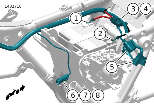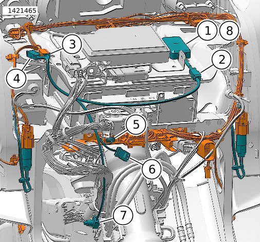 3. | איור 11 העבר את הסתעפות הרתמה [350A] (6) לתוך אזור תיבת המצבר. | |