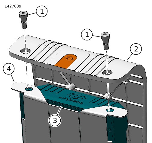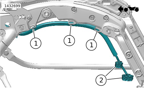 1. | איור 10 העבר את הרתמה החיצונית של תיק האוכף לאורך המסגרת. השתמש באזיקונים כדי לחבר את הרתמה בצורה רופפת לנקודות העיגון (1). אל תהדק את האזיקונים. | |