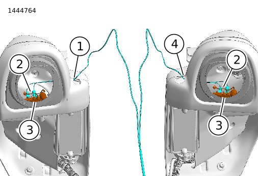 2. | Gambar 1 Arahkan terminal speaker (2) melalui lubang akses (1, 4) di dalam fairing bagian bawah. a. Pasang speaker di dalam boks. Lihat kit yang sesuai untuk pemasangan. b. Panjang kabel harnes adalah sama. Kenali sisi kanan dan kiri dengan warna kabel. c. Kanan: Biru muda dan biru muda/hitam. d. Kiri: Biru muda/jingga dan biru muda/abu-abu. e. Biarkan harnes cukup kendur untuk memungkinkan pemindahan speaker. | |