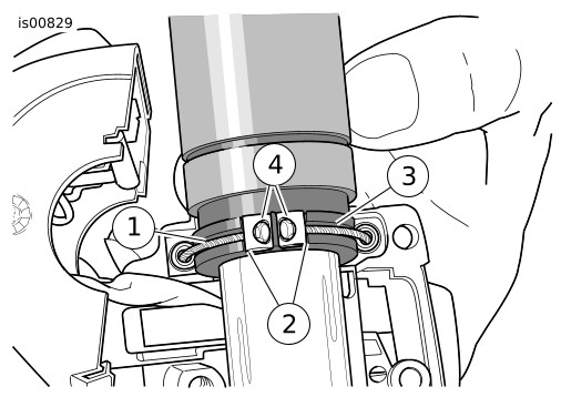 | 4. | Една по една скоба, като скобите да са изправени нагоре и навътре от скобата на предното стъкло (2), затегнете раменните болтовете (1) достатъчно, за да се поддържа ориентацията на скобата спрямо предното стъкло по време на монтажа на предното стъкло на мотоциклета. Болтове ще бъдат напълно затегнати по-късно. |