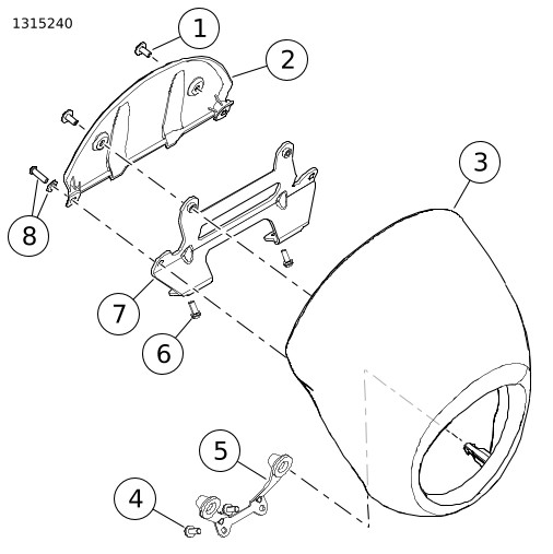1. | Lihat Gambar 2 . Lepas tameng batok lampu a. Lepas sekrup dan cincin pengunci (8). b. Tarik tameng batok lampu (3) dari braket bagian atas (7). c. Tarik tameng batok lampu dari braket bagian bawah (5) untuk melepaskan kaki dari gromet. | |