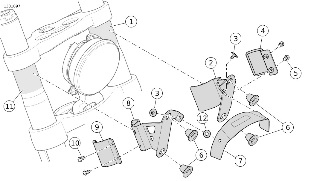4. | Pasang braket tudung. a. Rekatkan cincin pengunci plastik (12) ke setiap lubang braket kap (7). b. Sejajarkan lubang pengencang di rakitan braket kiri dan kanan (2 dan 8) dengan braket tudung (7). c. Pastikan braket tudung (7) berada di tengah lampu depan. d. Pasang pengencang berbentuk pohon (3) ketika semua braket benar-benar sejajar. | |