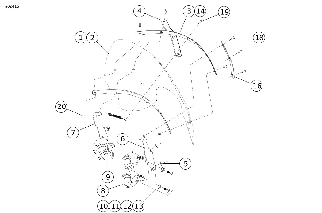 2 | Kaca depan, profil rendah, buram, lampu ganda | 57341-08 | 12 | Kit perangkat keras, dudukan kaca depan (4) (mencakup item 13 hingga 15) | 58790-04 | |