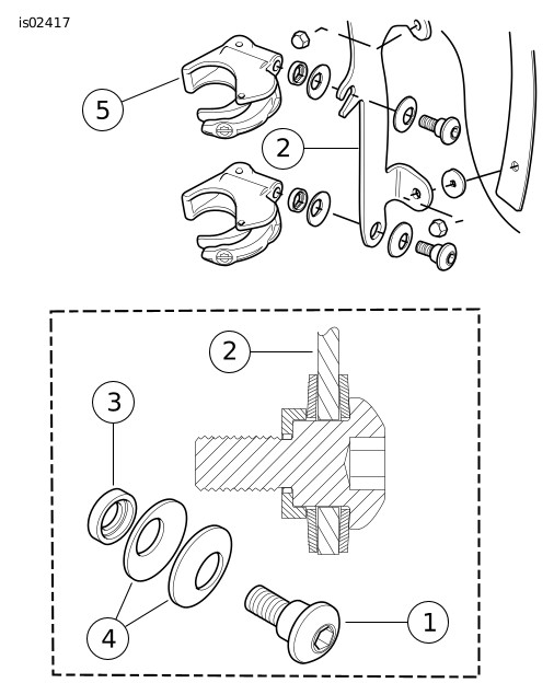 4. | Dengan klem (5) menghadap ke atas serta ke dalam braket kaca depan (2), kencangkan secukupnya baut bahu (1) hingga dapat menahan posisi klem pada kaca depan saat pemasangan kaca depan ke sepeda motor. Baut akan dikencangkan setelah kaca depan terpasang. Ulangi langkahnya dengan tiga klem lainnya. CATATAN Posisikan roda depan tegak lurus untuk mencegah braket menggores tangki bahan bakar. |