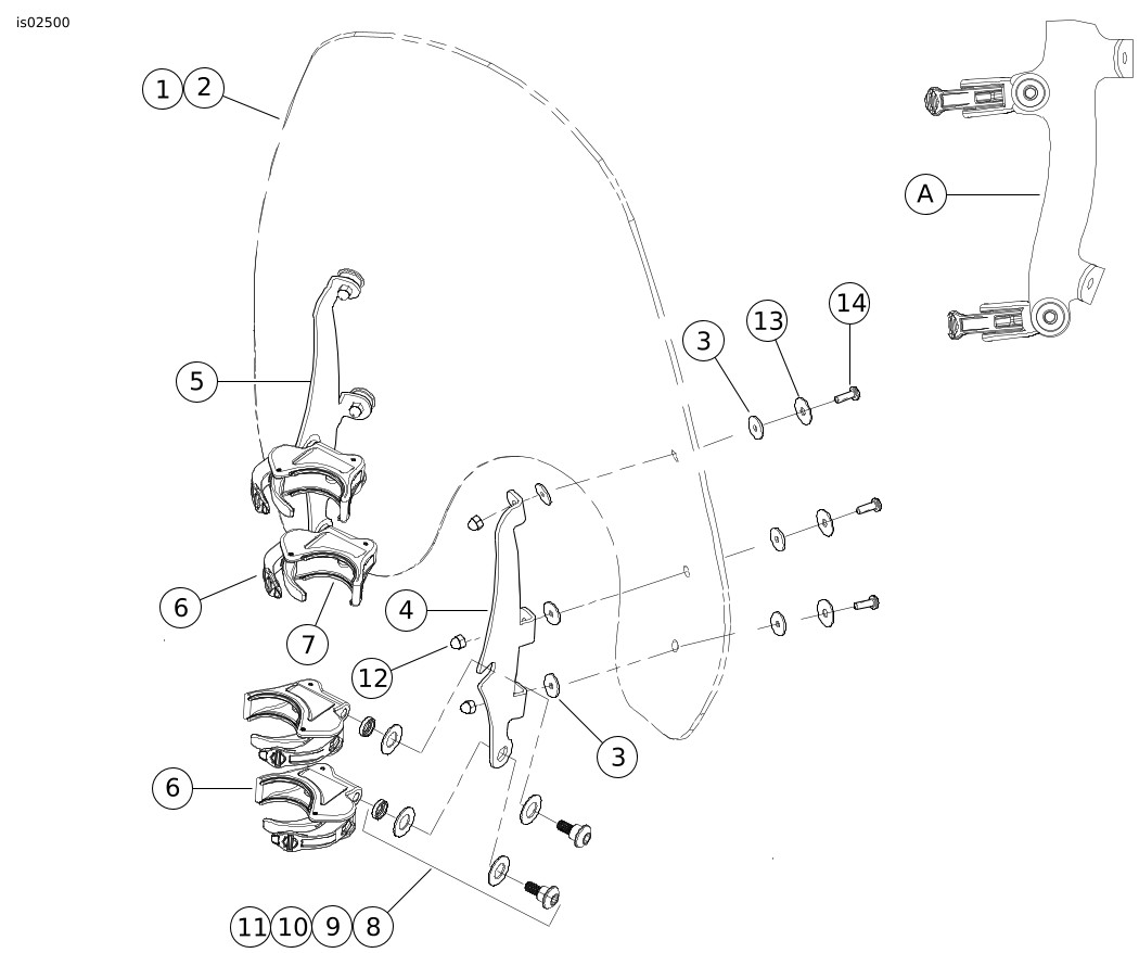 1 | Kit servis kaca depan, Super Sport (mencakup item 2 hingga 3) | 57302-06 | 8 | Kit perangkat keras, dudukan kaca depan (4) (mencakup item 9 hingga 11) | 58790-04 | |